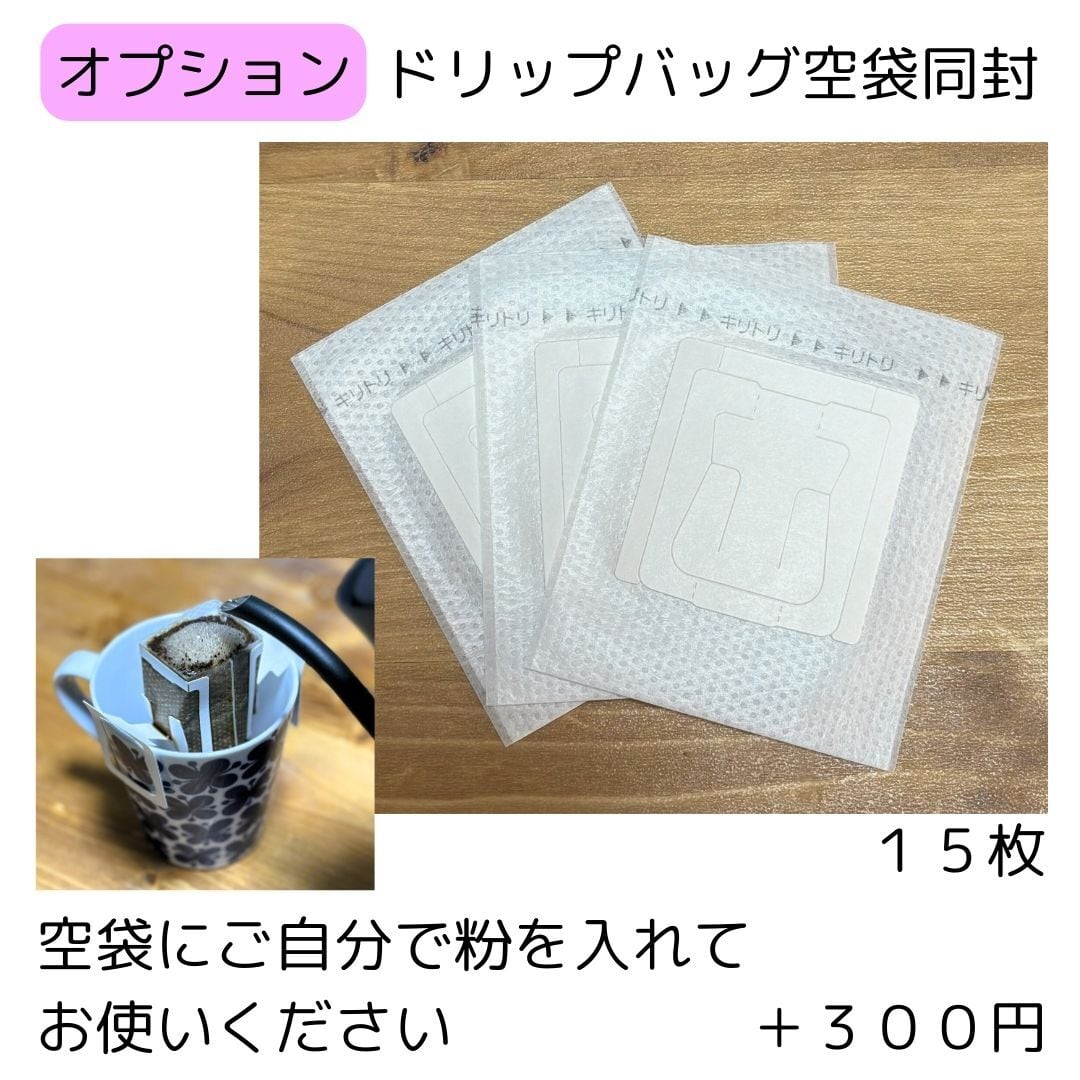 ドリッパーをお持ちでないお客様は、オプションで「ドリップバッグ封入(簡易包装)」または「1杯用コーヒードリップバッグ 空袋15枚同封」を選択いただき、併せてご注文いただければ、ご家庭で簡単に薫り高いコーヒーをお楽しみいただけます。